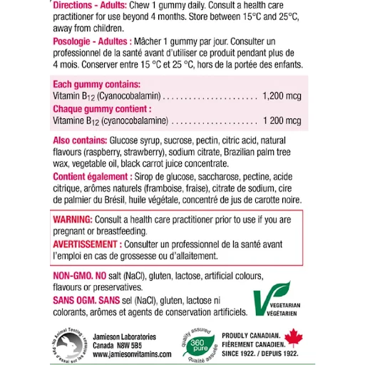 Get a natural energy boost with Jamieson Vitamin B12 Gummy. These delicious raspberry-flavored gummies provide 1,200 mcg of Vitamin B12 per serving, helping your body convert carbohydrates, proteins, and fats into energy. They are gelatin-free, gluten-free, and contain no artificial colors, flavors, or preservatives. Chew one gummy daily and store between 15C and 25C, away from children. Consult a healthcare practitioner for use beyond four months.