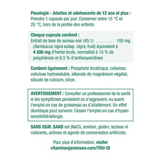 Québec regulation does not allow pharmacist-owners to award PC Optimum bonus points on any medication or activity related to the practice of pharmacy. Jamieson’s Black Elderberry is comprised of 100 mg of Black Elderberry extract to help relieve symptoms of colds and flus such as coughs, sore throat and mucus buildup of the upper respiratory tract. This one-a-day formula is suitable for both adolescence and adults and is TRU-ID certified to guarantee ingredient authenticity. Product information is provided by the product vendor. This content is a summary for informational purposes only and does not have all possible information about this product. It should not be used as a substitute for advice from health care professionals, as this information alone does not assure that this product is safe, effective, or appropriate for you. For more detailed information on this product, including reported and possible side effects and contraindications, refer to the manufacturer’s monograph, or speak with a health care provider.