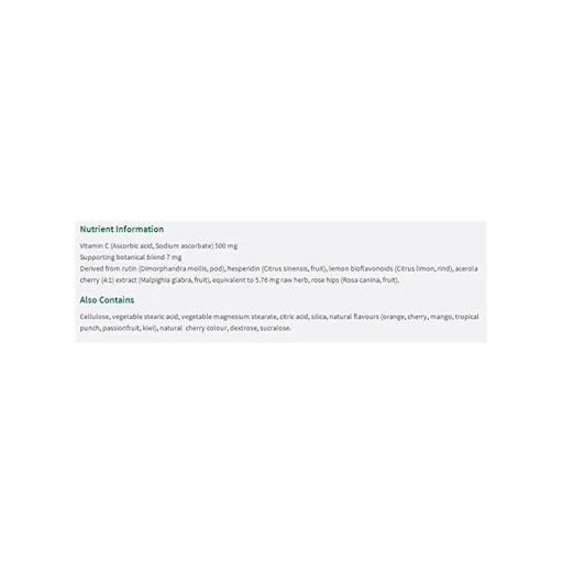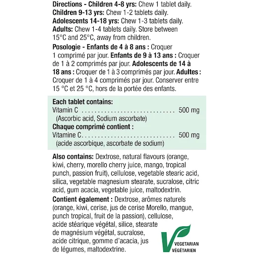 Québec regulation does not allow pharmacist-owners to award PC Optimum bonus points on any medication or activity related to the practice of pharmacy. Chewable Vitamin C 500 mg Mixed Fruit is a powerful antioxidant. It offers a variety of benefits from boosting the immune system to promoting healthy capillaries, teeth and gums, and aiding in iron absorption. Product information is provided by the product vendor. This content is a summary for informational purposes only and does not have all possible information about this product. It should not be used as a substitute for advice from health care professionals, as this information alone does not assure that this product is safe, effective, or appropriate for you. For more detailed information on this product, including reported and possible side effects and contraindications, refer to the manufacturer’s monograph, or speak with a health care provider.