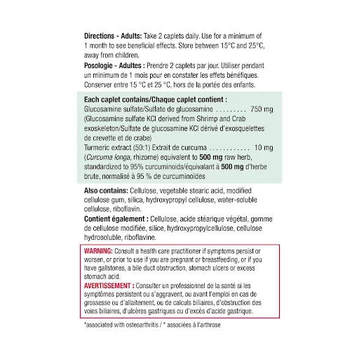 Québec regulation does not allow pharmacist-owners to award PC Optimum bonus points on any medication or activity related to the practice of pharmacy. Glucosamine Turmeric Complex provides relief from joint pain and inflammation while also supporting the maintenance of healthy cartilage. Product information is provided by the product vendor. This content is a summary for informational purposes only and does not have all possible information about this product. It should not be used as a substitute for advice from health care professionals, as this information alone does not assure that this product is safe, effective, or appropriate for you. For more detailed information on this product, including reported and possible side effects and contraindications, refer to the manufacturer’s monograph, or speak with a health care provider.