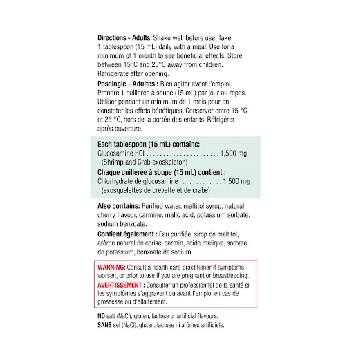 Québec regulation does not allow pharmacist-owners to award PC Optimum bonus points on any medication or activity related to the practice of pharmacy. Liquid Glucosamine 1,500 mg is a great-tasting wild cherry flavoured formula that provides long-lasting pain relief and helps with the maintenance of joint and catilage health. Product information is provided by the product vendor. This content is a summary for informational purposes only and does not have all possible information about this product. It should not be used as a substitute for advice from health care professionals, as this information alone does not assure that this product is safe, effective, or appropriate for you. For more detailed information on this product, including reported and possible side effects and contraindications, refer to the manufacturer’s monograph, or speak with a health care provider.