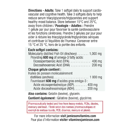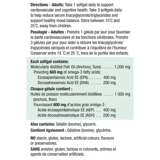 Québec regulation does not allow pharmacist-owners to award PC Optimum bonus points on any medication or activity related to the practice of pharmacy. Omega-3 Complete helps promote cognitive and cardiovascular health. Using a purified combination of premium omega-3 fish oils, it provides high potentcy DHA and EPA in an easily absorbable triglyceride form. Product information is provided by the product vendor. This content is a summary for informational purposes only and does not have all possible information about this product. It should not be used as a substitute for advice from health care professionals, as this information alone does not assure that this product is safe, effective, or appropriate for you. For more detailed information on this product, including reported and possible side effects and contraindications, refer to the manufacturer’s monograph, or speak with a health care provider