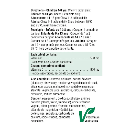 BONUS 120 tablets for the prices of 100 Boost your health with these tasty vitamin C chewables! Jamieson Vitamins Vitamin C Wild Berry Chewables 500 mg (120 tablets) is a nutritious daily supplement with natural blueberry, raspberry and strawberry flavours! Vitamins and nutrients taken from plant extracts, such as lemons, cherries and rose hips, fortify the immune system and help protect your system against free radicals and viral and bacterial infections. Other health benefits include the following: supports gum, teeth and total mouth health supports immune health and helps relieve cold and flu symptoms helps the body heal wounds and broken bones aids in iron absorption in the intestines plays a role in red blood cell production in bone marrow helps the body make collagen and connective tissues Some research also suggests that vitamin C supplements may help reduce the look of broken, leaky capillaries. Capillaries are small, fine connections in the circulatory system that connect veins and arteries. They exchange water, nutrients, oxygen and waste between all cell tissues in the human body, are therefore are important to overall health! Take 1-4 Vitamin C Wild Berry Chewables daily with food.