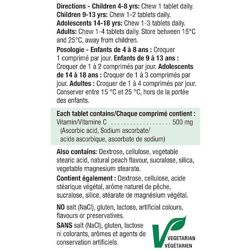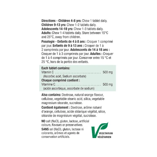 Québec regulation does not allow pharmacist-owners to award PC Optimum bonus points on any medication or activity related to the practice of pharmacy. Jamieson Vitamin C Chewables deliver 500 mg of vitamin C in each tablet. Vitamin C supports immune health and provides a source of antioxidants for the maintenance of good overall health. With no added colours or flavours, these great-tasting tablets are the fun and delicious way to supplement with vitamin C! Product information is provided by the product vendor. This content is a summary for informational purposes only and does not have all possible information about this product. It should not be used as a substitute for advice from health care professionals, as this information alone does not assure that this product is safe, effective, or appropriate for you. For more detailed information on this product, including reported and possible side effects and contraindications, refer to the manufacturer’s monograph, or speak with a health care provider.