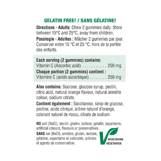 Product Description: Jamieson vitamin C gummies. Vitamin C is an important nutrient for optimal health. It boosts immunity to help resist infections, and it fights damaging free radicals, thereby playing a part in preventing chronic diseases. According to the Heart & Stroke Foundation of Canada, however, half of all Canadians do not eat the recommended 7 to 10 servings of fruits and vegetables daily that provide essential Vitamin C. Jamieson’s Vitamin C Gummies are a fun and tasty way to meet your daily Vitamin C requirements. The delicious orange-flavoured formula is made with fruit pectin (gelatin-free), which makes it suitable for vegetarian diets. It is also free of aspartame, artificial colours and artificial flavours. Like all Jamieson products, Vitamin C Gummies are pharmaceutically tested to guarantee purity, potency and traceability. Helps in wound healing.